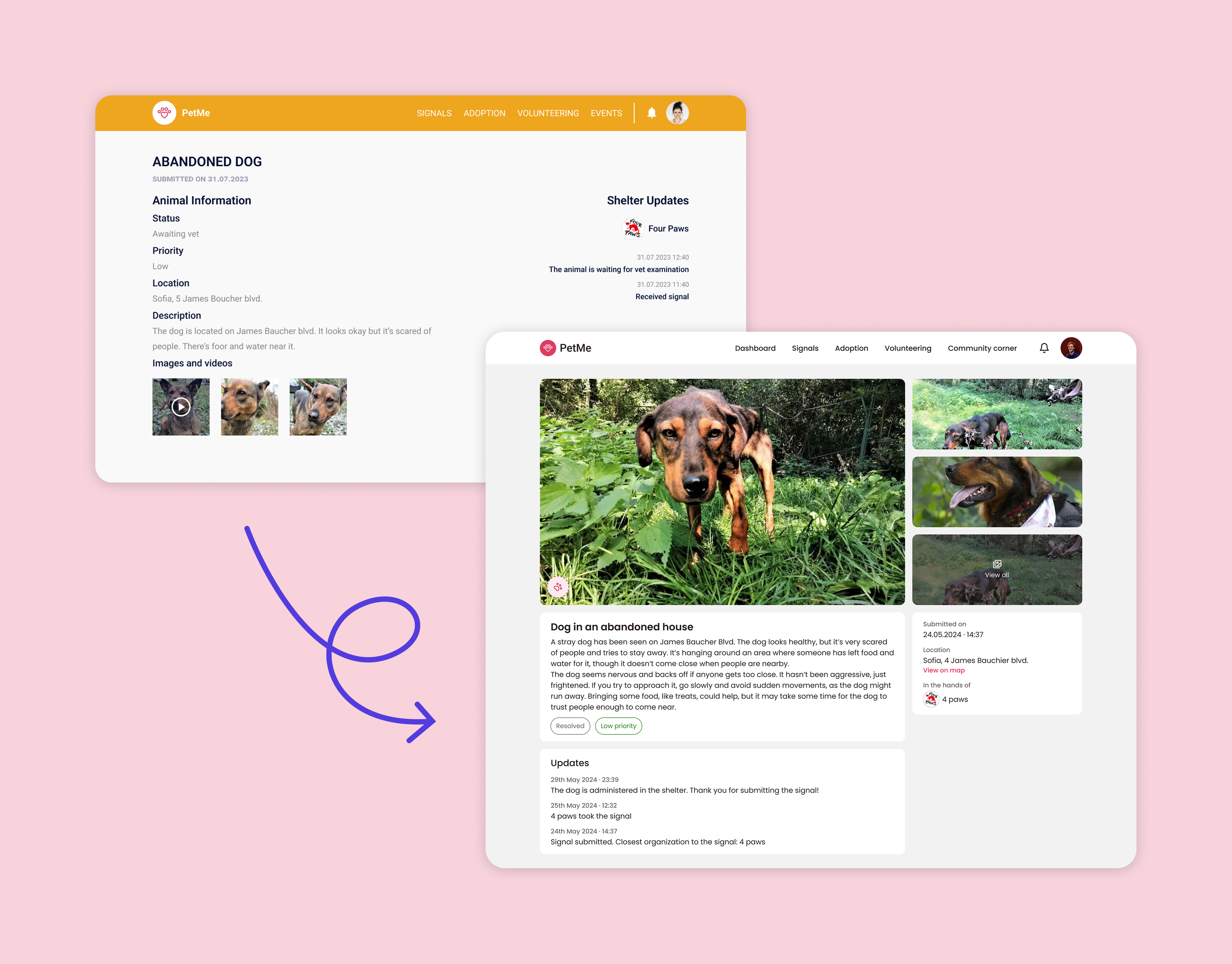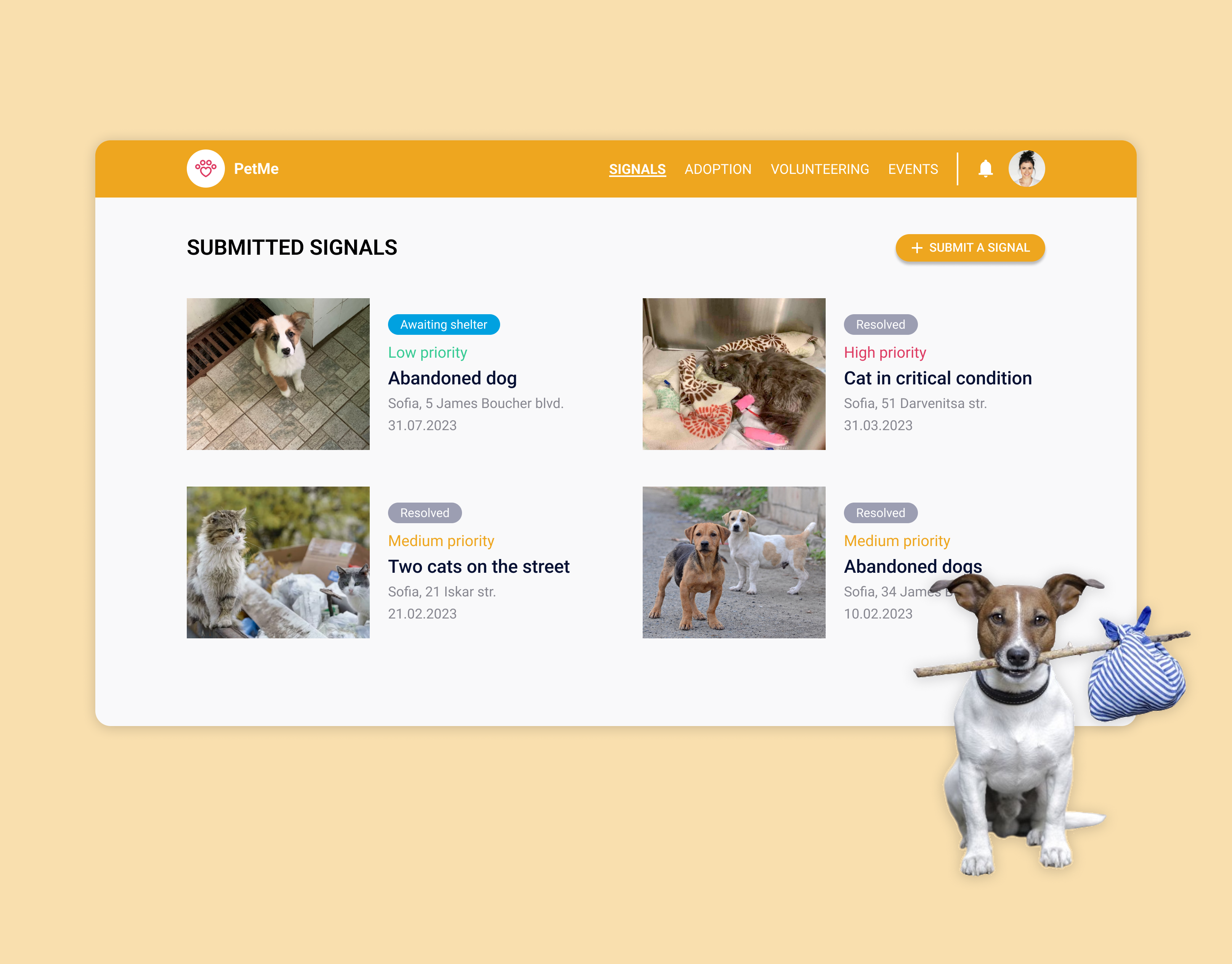 Designing a web application that helps reduce the number of stray animals in Bulgaria by enabling users to report injured animals, (virtually) adopt pets, volunteer at shelters, and engage with animal welfare events.
